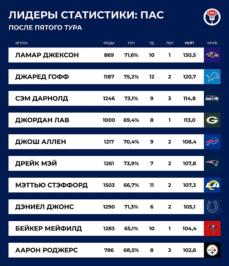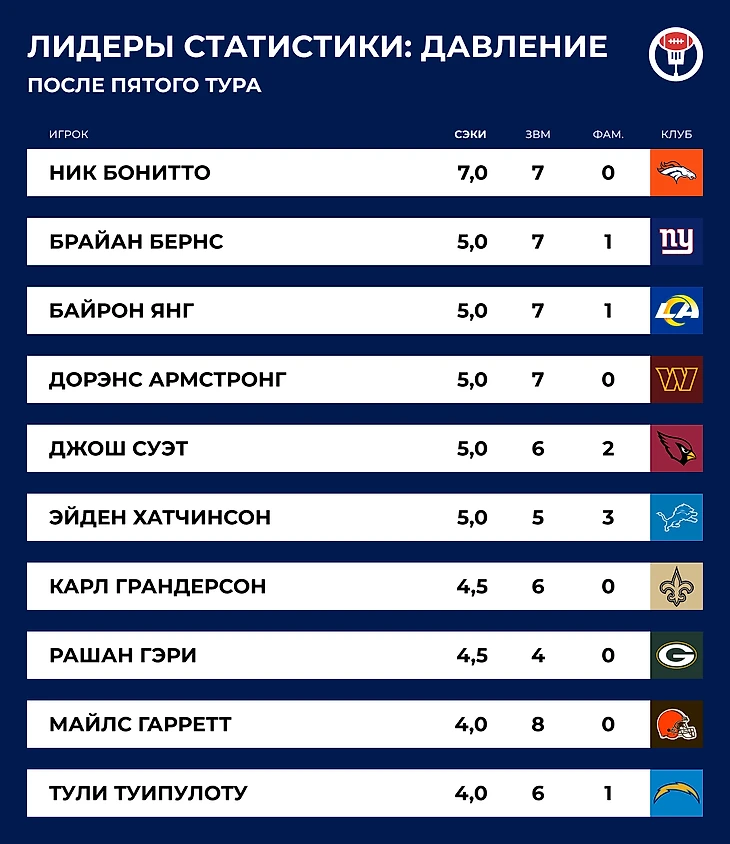 Ресивер-новичок «Тампа-Бэй» Эмека Эбука продолжает разрывать НФЛ — набрал 163 ярда против защиты «Сиэтла» и стал единственным новичком в истории лиги, которому удалось за первые пять матчей поймать 25 передач и занести пять тачдаунов. А показателем в 400+ ярдов и пять тачдаунов на приеме за последние 40 лет могут похвастать только Рэнди Мосс (1998), Терри Маклорин (2019) и Джамарр Чейз (2021). Отличная компания! Может быть, теперь Гронк научится выговаривать его фамилию?