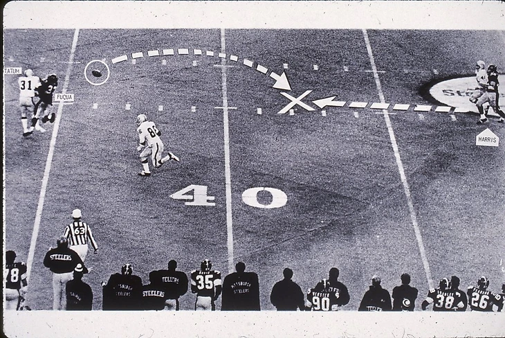 47. Легендарный оператор NFL Films Эрни Эрнст снимал Франко на протяжении всего матча и снял культовый кадр, где Харрис подбирает мяч, который вы, вероятно, видели миллион раз.