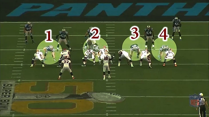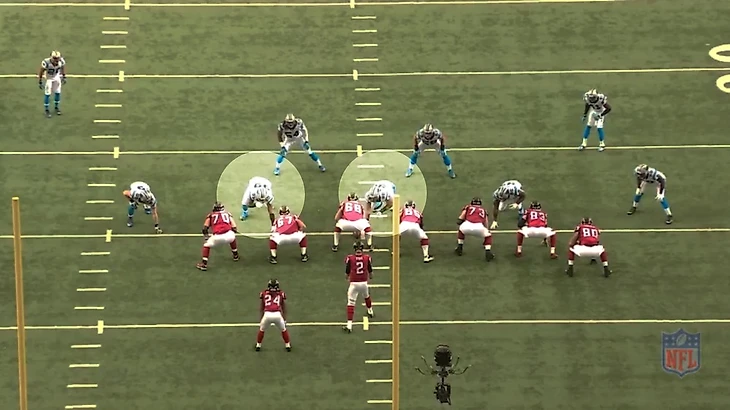 Рассмотрим тот же кадр из записи встречи Каролины и Атланты. Играющий против центра дифенсив-тэкл играет технику 1 на закрытой (сильной) стороне, второй тэкл играет технику 3 на открытой стороне. Перед нами “4-3 under”.