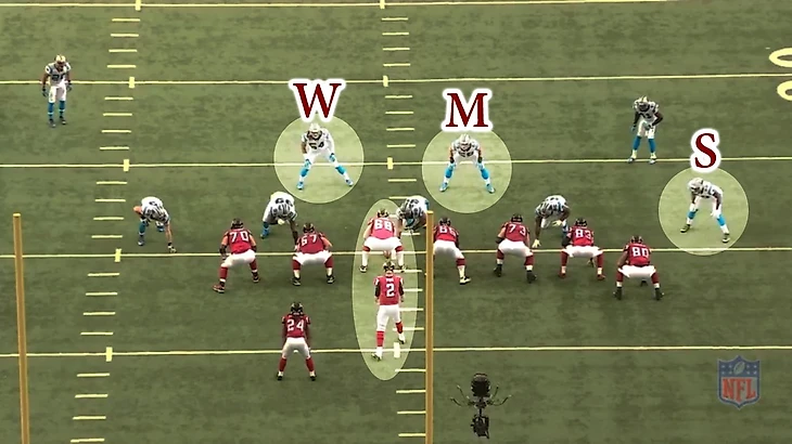 Давайте посмотрим на расстановку лайнбекеров Каролины в игре с Атлантой. На скриншоте видно, что в данном розыгрыше Атланта использует двух тайт-эндов, 83 и 80 номера, Тамме и Тойлоло. Правая от Мэтта Райана сторона называется “сильной” с точки зрения нападения и “закрытой” с точки зрения защиты.
