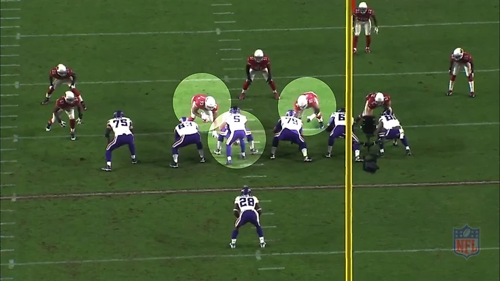 “4-3 овер” хороша для остановки выноса, все три лайнбекера играют либо в прикрытии против коротких передач, либо закрывая гэпы при выносе. В нашем случае последует вынос Адриана Питерсона на три ярда.