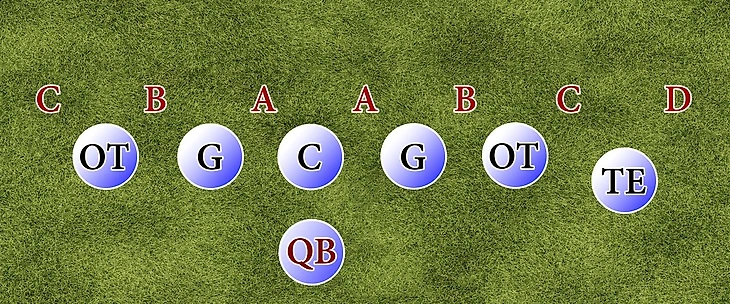 Гэпы делят на четыре типа, A-gap - гэп между центром и гардом, B-gap - между гардом и тэклом. C-gap - с внешней стороны линии, за тэклом слабой стороны или между тэклом сильной стороны и тайт-эндом, D-gap - “совсем” снаружи, за тайт-эндом.