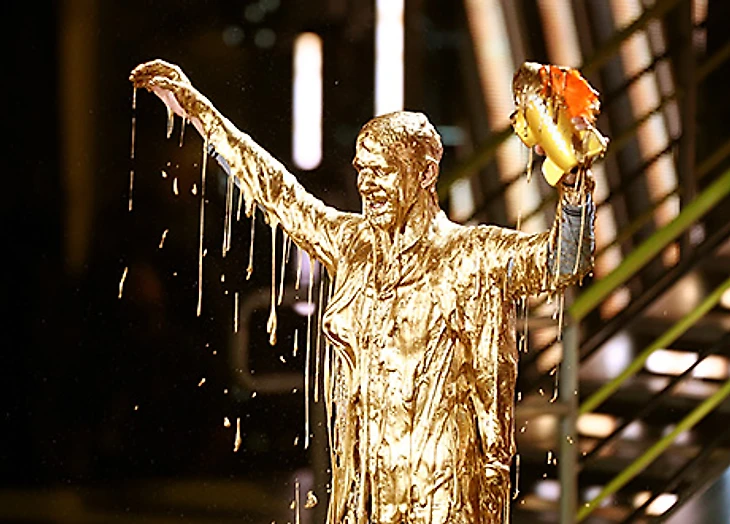 Когда 23-кратный олимпийский чемпион поднялся на сцену за наградой, организаторы церемонии облили его с ног до головы золотой краской.