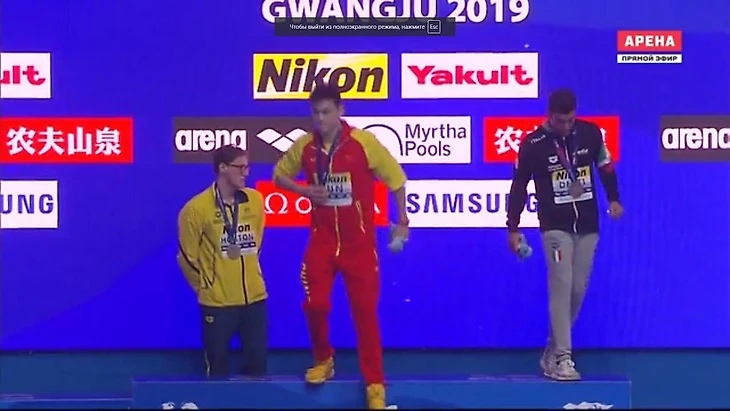 Олимпийский чемпион 2016 года австралиец Мэк Хортон, который на чемпионате мира в Кванджу выиграл серебро на 400 м вольным стилем, отказался подниматься на пьедестал почета и не пожал руку победителю – китайцу Сунь Яну.