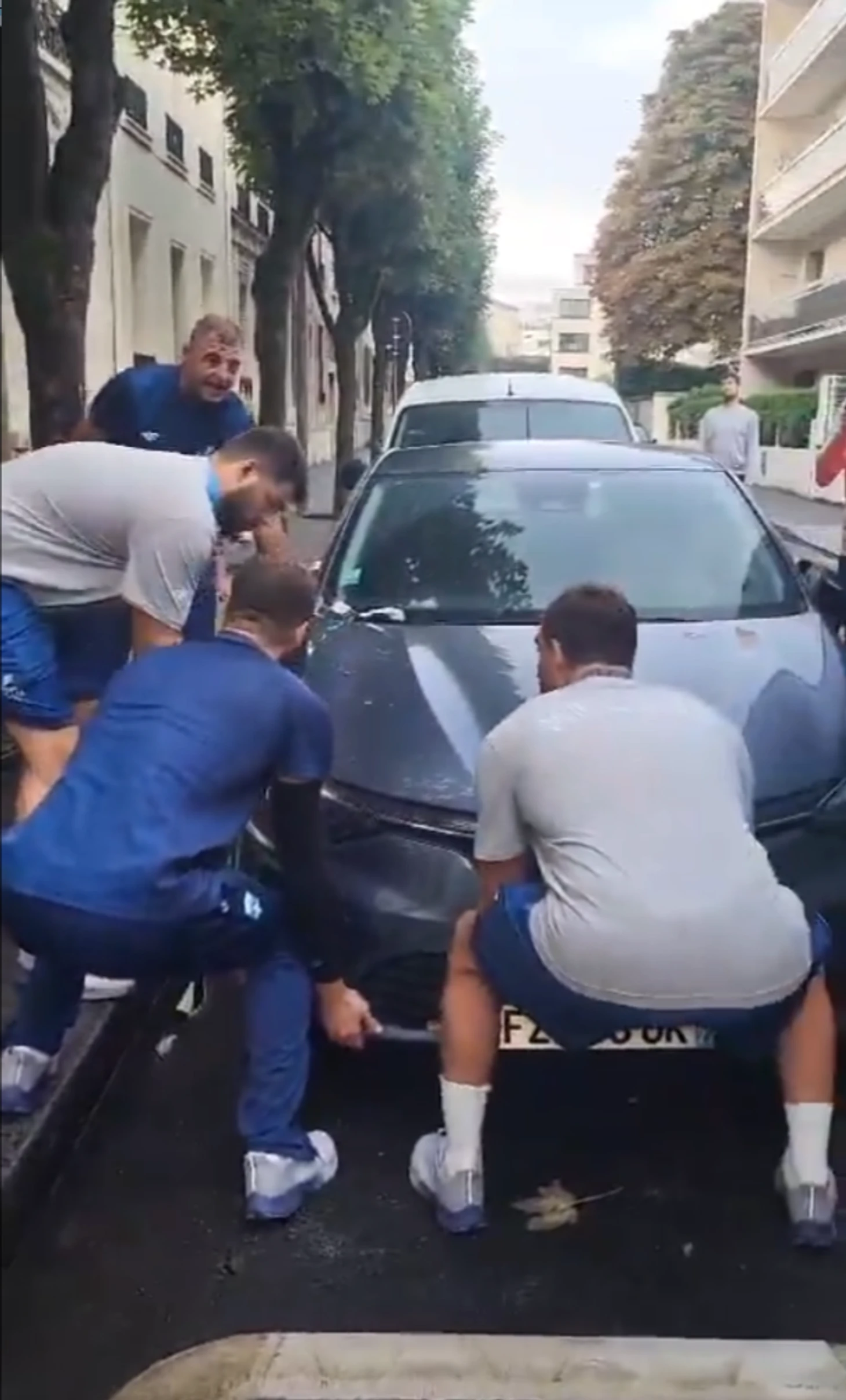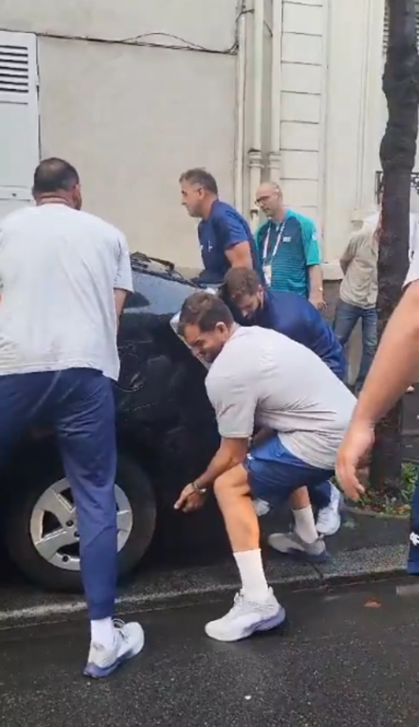 Ватерполисты олимпийской сборной Греции передвинули машины, мешавшие проезду их автобуса в Париже.