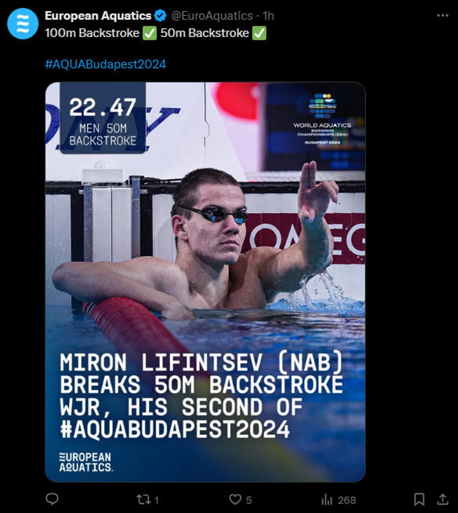 European Aquatics опубликовала новость о победе Лифинцева на ЧМ по плаванию. Ранее его победы не упоминались