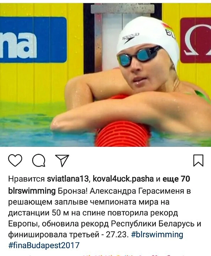 Девять сотых секунды не хватило легендарной белорусской пловчихе Александре Герасимене, чтобы стать победительницей чемпионата мира по водным видам спорта, проходящего в эти дни в Будапеште.