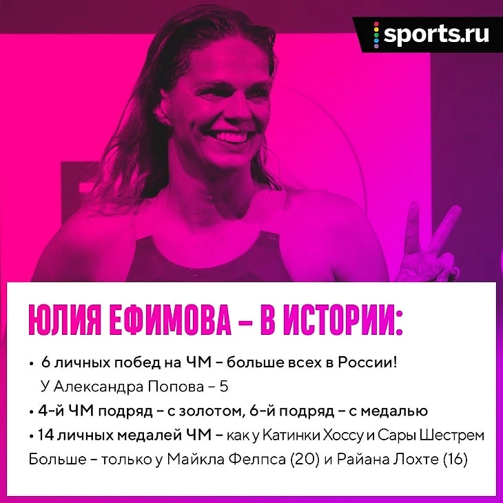 Ефимова настоящая звезда, если не уйдет после олимпиады сразу не закончит, то сможет стать по медалям второй после Фелпса (ну если на 50 в этом году получится), а ведь чуть не потеряла всё из-за мельдония.