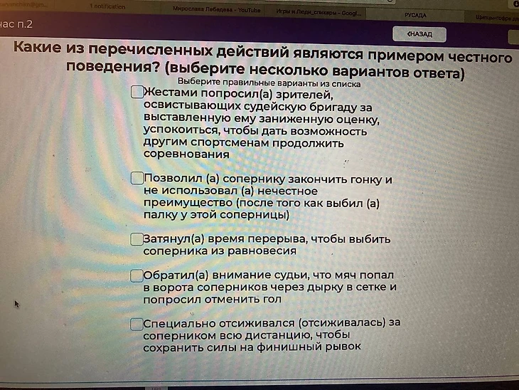 Далеко не весь материал теста имеет отношение к антидопингу. РУСАДА толкует «ценности спорта» максимально широко и, например, есть вот такой вопрос.