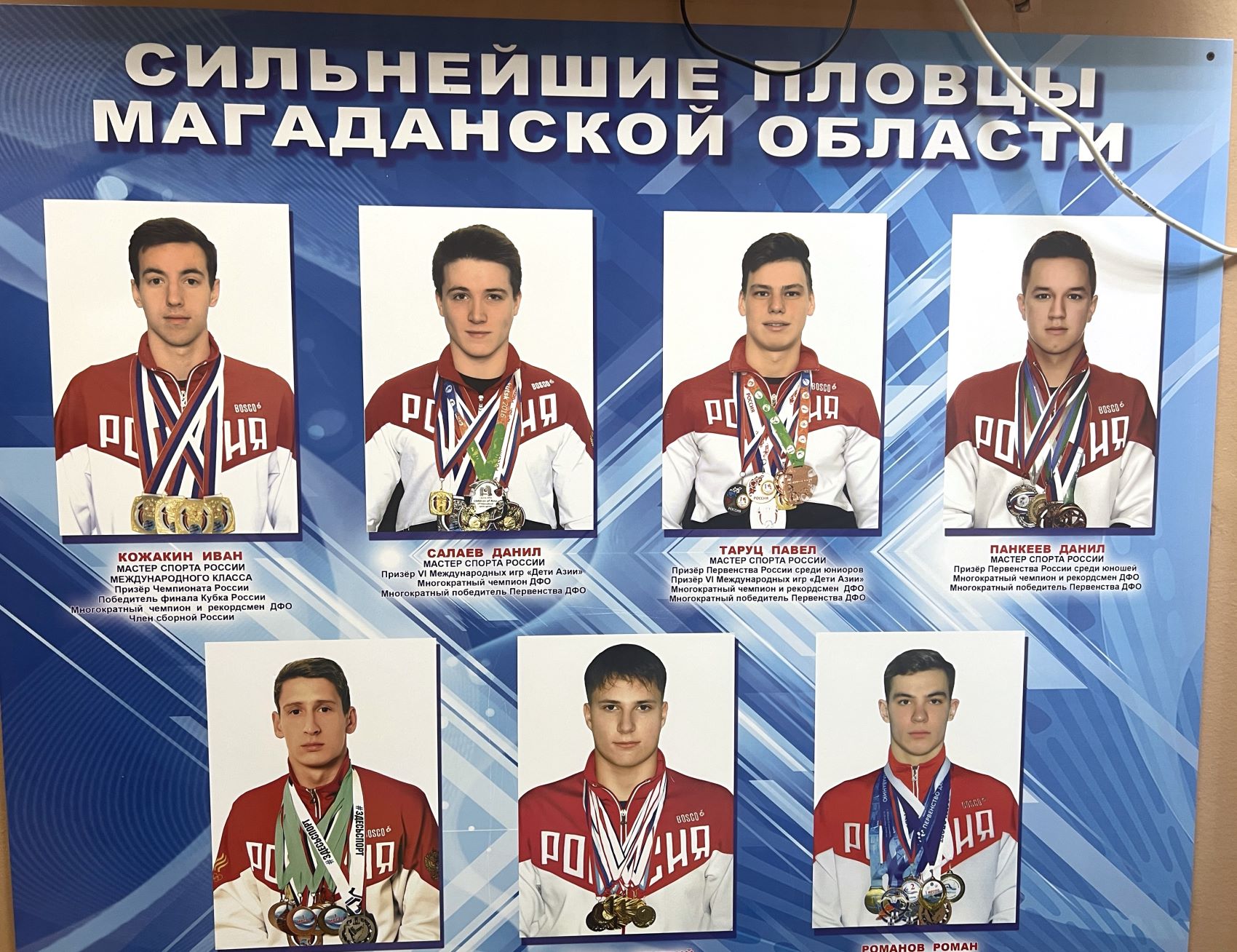 В Магадане никогда не было пятидесятиметрового бассейна. Все три мастера спорта международного класса по плаванию в истории региона воспитывались в стенах двадцатипятиметрового бассейна «Когалымский» 1967 года постройки. Сюда мы и приехали. На входе встретил стенд с фотографиями сильнейших пловцов Магаданской области.