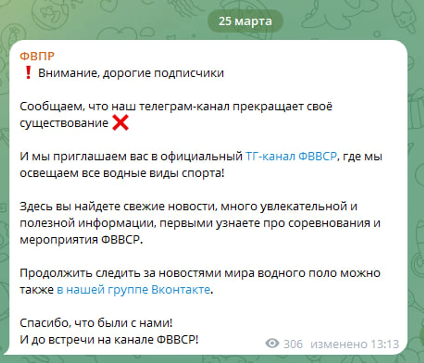 Было принято решение о закрытии бывшего официального телеграм-канала Федерации водного поло России.