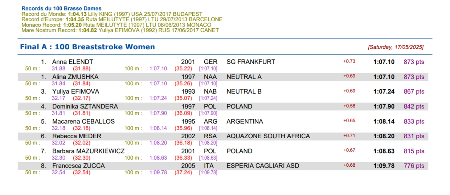 «Маре Нострум» – это турнир, где пловцы представляют и страны, и свои клубы. Но россияне числились в протоколах исключительно как «нейтралы», под аббревиатурой NAB (Neutral Athletes B – соответственно, белорусам досталась буква A).