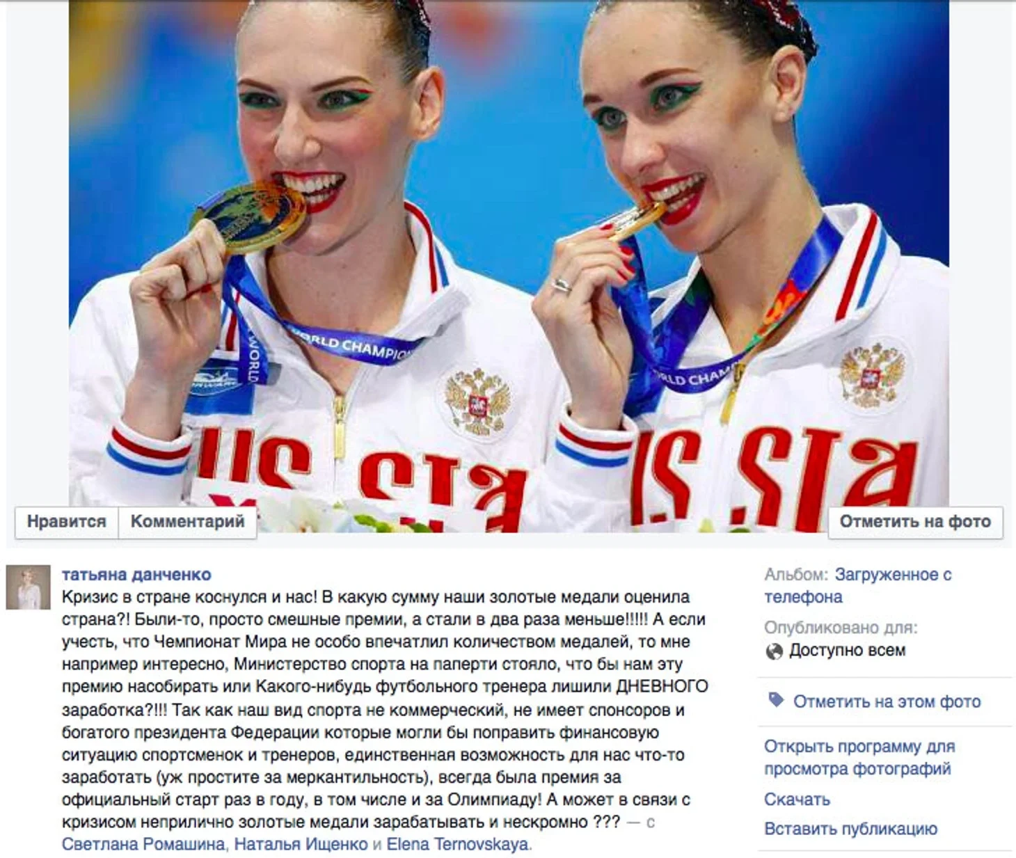 «Кризис в стране коснулся и нас! В какую сумму оценила наши золотые медали страна? Были просто смешные премии, а стали в два раза меньше. Мне интересно, министерство спорта на паперти стояло, чтобы нам эту премию насобирать, или какого-нибудь футбольного тренера лишили дневного заработка?
