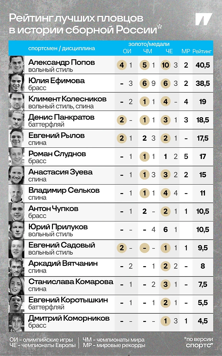 Еще один пример уважения к плаванию – результаты масштабного проекта «100 лучших спортсменов в истории России», который Спортс’’ проводил в 2023-м. По его итогам в топ-40 оказались два представителя плавания – Александр Попов (19-е место) и Юлия Ефимова (40-е), а еще двое – Евгений Рылов (72-е) и Денис Панкратов (92-е) – попали в топ-100.