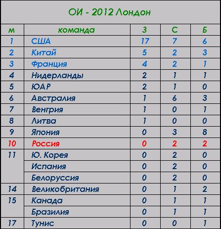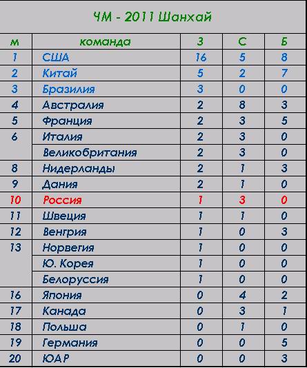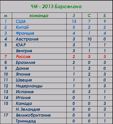 Первое, что бросается в глаза, при анализе таблиц медального зачёта, это некоторое отступление с привычных позиций плавательной команды США. Причины тут две: первая, - временно прекратил свои выступления на турнирах, великий и ужасный Майкл Фелпс, и вторая, - в женском брассе наступила эпоха противостояния Ефимова - Мейлутите. Частично, "золотые" потери американской сборной смогла компенсировать вундеркинд Кати Ледецки, подчистую "выкашивая" первые места в женских стаерских дисциплинах.
