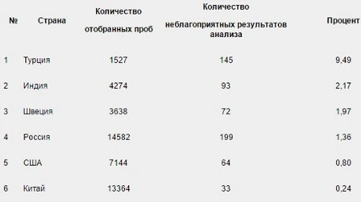 Абсолютные цифры выявления нарушений антидопинговых правил в той или иной стране и видах спорта должны быть оценены с учетом численности международного и национального пулов тестирования спортсменов. Россия является крупнейшей спортивной державой, и РУСАДА проводит наибольший объем тестирования среди всех национальных антидопинговых организаций. Ниже приводится таблица, иллюстрирующая выявление случаев нарушения антидопинговых правил в процентах от общего числа тестов.
