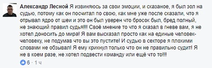 И судью в секторе я плохими словами не обзывал! Я ему крикнул только, что он не правильно судит! Я ни в коем разе не хотел подвести команду или еще что-то», – написал Лесной в комментариях под постом начальника отдела по работе со СМИ сайта RusAthletics Аллы Глущенко.
