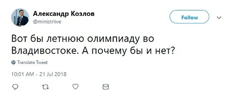 «Вот бы летнюю Олимпиаду во Владивостоке. А почему бы и нет?» — написал Козлов.
