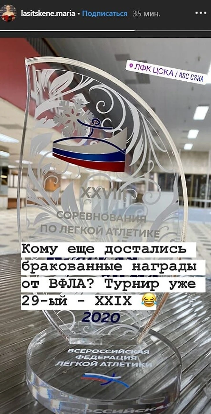 Трехкратная чемпионка мира по прыжкам в высоту Мария Ласицкене показала в инстаграме награду за победу в турнире «Русская зима» с надписью «28-е соревнования по легкой атлетике».