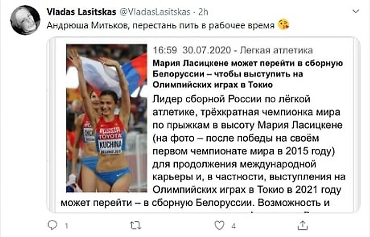 «Андрюша Митьков, перестань пить в рабочее время😘», – написал Ласицкас.