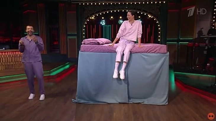 «Сериал «Чики» снимали на стадионе, где я училась прыгать». Ласицкене в «Вечернем Урганте» рассказала о Прохладном и прыгнула на кровать высотой 1,60 м
