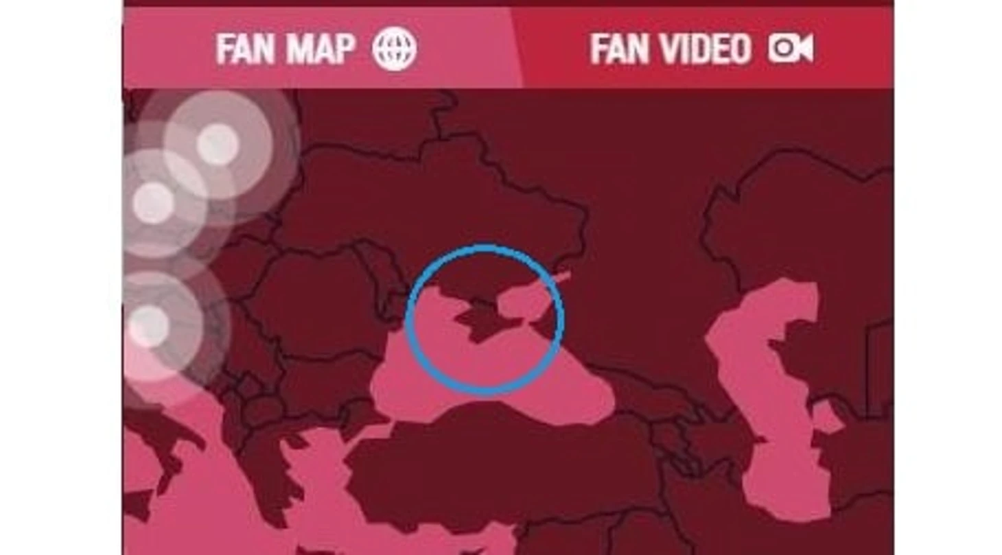 Во всплывающем окне Olympics Cheer Zone, где болельщики выражают поддержку спортсменам, между Украиной и Крымом проведена линия границы.