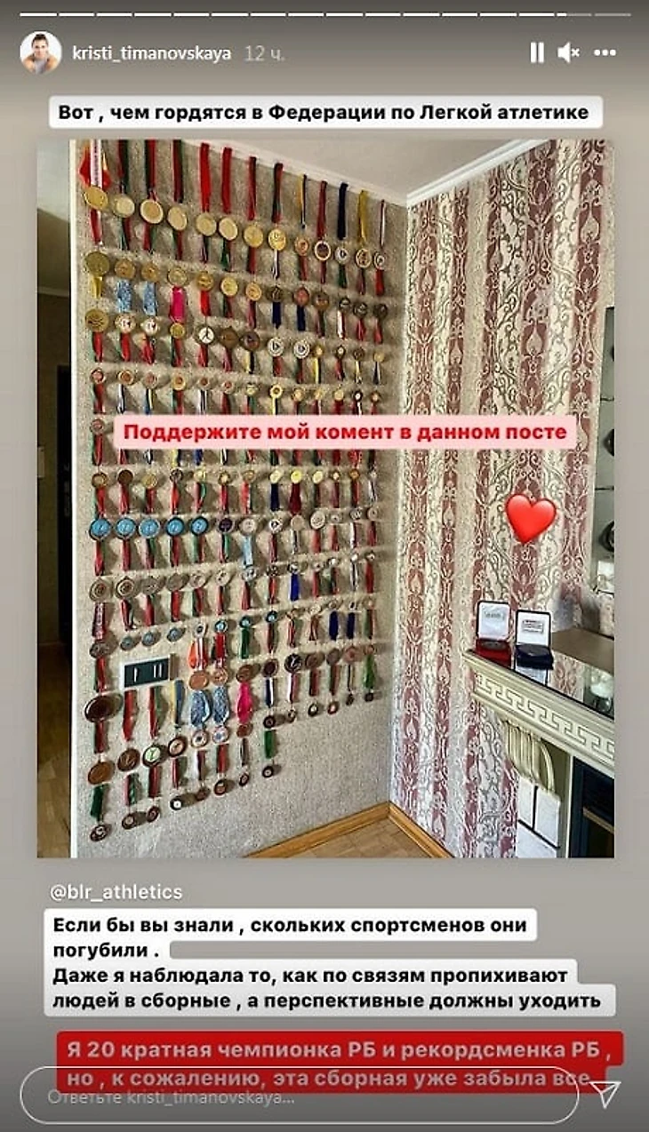 Я двадцатикратная чемпионка Беларуси и рекордсменка страны, но, к сожалению, эта сборная уже забыла все», – написала Тимановская.