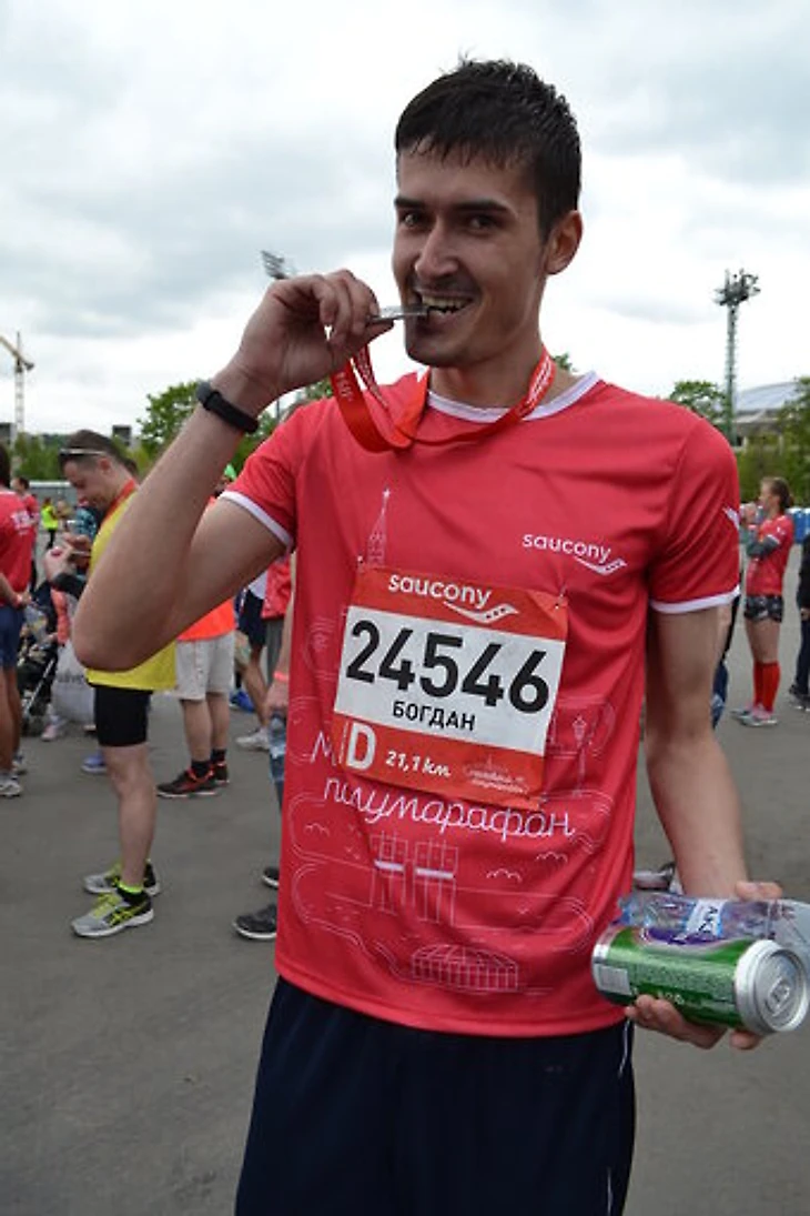 Что же по самому бегу, то бежалось нормально. Если б не дававшие о себе знать колени (привет, баскетбол), так вообще было бы шикарно. А дыхательных сил осталось с лихвой. Тяжеловато было последние километра 3. И то, думаю, скорее от осознания близости цели.Мое итоговое время составило 1:57:09. И без ложной скромности замечу, что могу этим гордиться. Никогда представить не мог, что буду бежать 21,1 км.На финише всех ждала медаль. За участие. И это правильно. Потому что мы все герои.