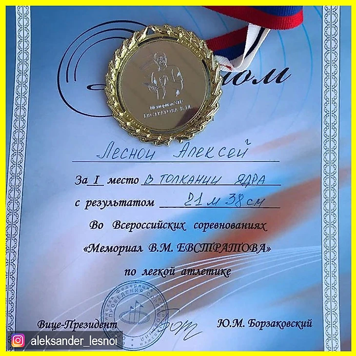 Ну, кто не знает Александра Лесного. Двукратный бронзовый призёр командных чемпионатов Европы (2013, 2014). Двукратный победитель зимних кубков Европы по метаниям (2014, 2018). Победитель всемирной Универсиады (2013). Двукратный национальный чемпион (2014, 2017).