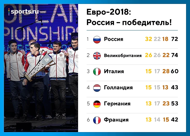 В Глазго наши спортсмены забрали 31 золотую медаль (всего 66); еще 6 наград (одно золото) завоевали в Берлине легкоатлеты, выступавшие в нейтральном статусе. Формально на две медали больше у Великобритании (на 8, если не учитывать нейтральных спортсменов, как предлагает официальный сайт ЧЕ), но по победам Россия первая в любом случае.