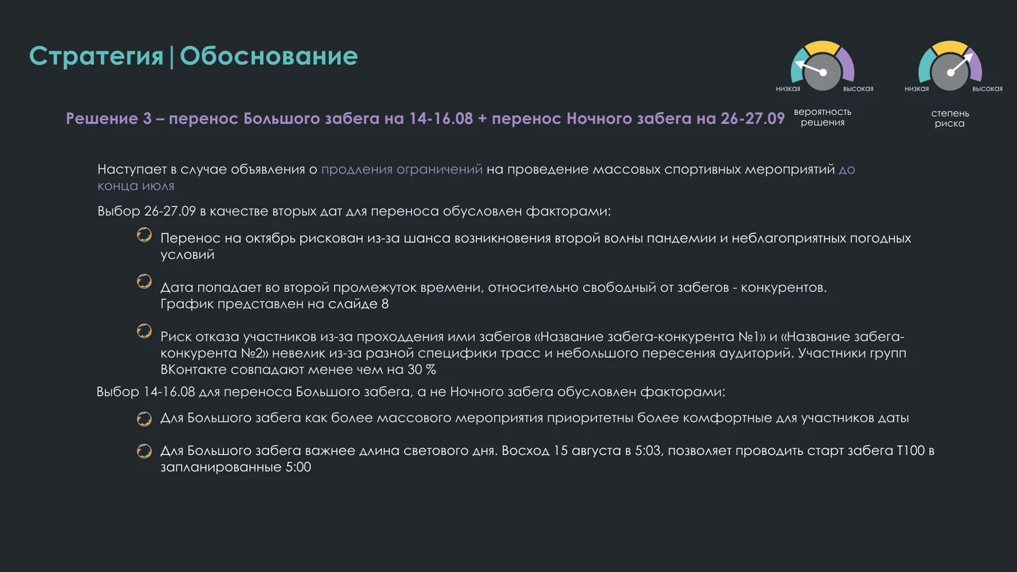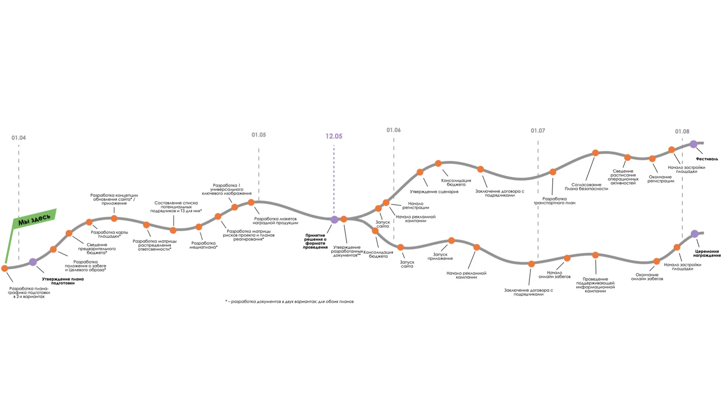 В процессе анализа прогнозов по развитию пандемии стало ясно, что остановиться на одном решении, как в кейсе с Фестивалем не получится. Поэтому мы предложили выбрать 2 точки принятия решения: 30 апреля и 8 июня. И совместить 2 стратегии: перенос и отложенное решение.