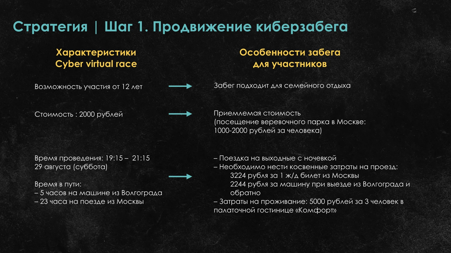 Шаг 2. Обзор возможностей. Учли риск продления ограничений на проведение массовых мероприятий до осени. Поэтому разработали критерии для мониторинга ситуации и дату окончательного принятия решения. А также предложили свое видение развития параллельных проектов: вертикальные забеги и Cyber Virtual Race – гонки с дополненной реальностью. Именно они – шанс для развития проекта в условиях запрета на массовые мероприятия.