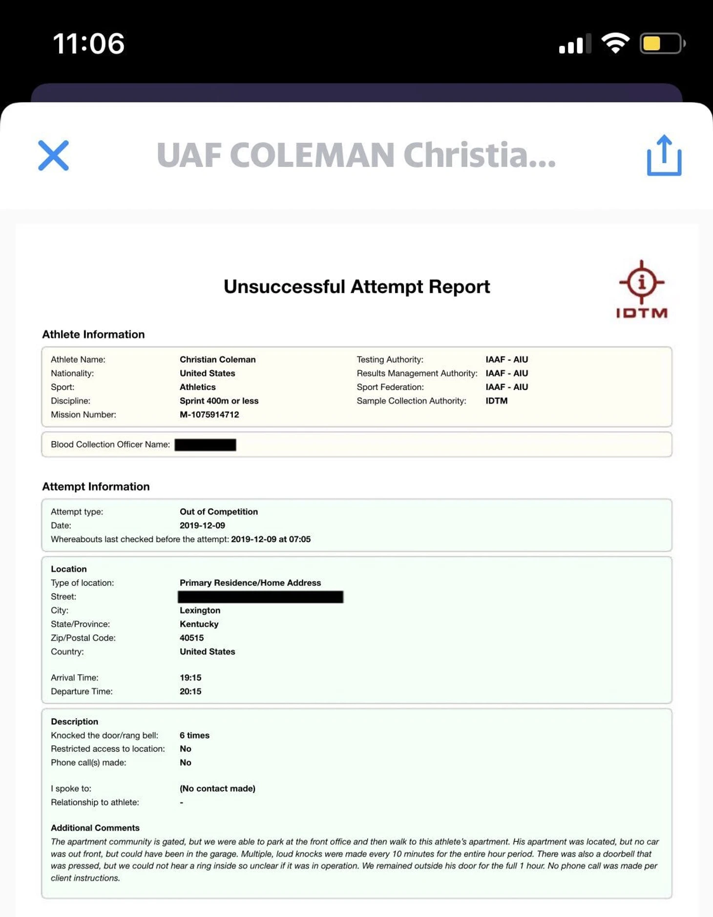 А про допинг-тесты, так тестируют непостоянно вне соревнований и тренировок, а в часовое окно, которое ты сам указываешь ( в документе оно есть) и обязуешься быть весь этот час в том месте, которое напишешь, офицер может и не звонить, если звонок в двери не работает - это твои проблемы. Если Коулмен написал, что в часовое окно для теста будет дома сидеть, а сам в магаз пошел, то это его проблемы. И главное если к тебе приходят не в часовое окно, то флажок не дают и самое главное, что за сутки до дедлайна ты можешь изменить часовое окно: время поменять или место где будешь находится.