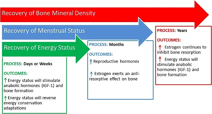 Необходимо запастись терпением. Восстановление адекватного уровня энергии обычно происходит спустя несколько дней или недель после того, как увеличивается потребление энергии и/или сокращается ее расход. Восстановление менструальной функции происходит за несколько месяцев (до полугода) после коррекции энергетического баланса. К сожалению, коррекция минеральной плотности костей может не наступить и в течение нескольких лет, даже после того, как восстановится энергетический баланс и менструальная функция.