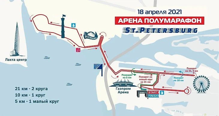 Бегуны, выбравшие дистанцию 21 км, побегут по центральной аллее Приморского Парка Победы, преодолеют Яхтенный мост, затем попадут в Парк 300-летия Санкт-Петербурга, добегут до Лахта-Центра, вернутся к стадиону Газпром Арена, чтобы развернуться и уйти на второй круг. Участники на 10 км пробегут только один такой круг, а для тех, кто бежит 5 км, организаторы подготовили отдельный маршрут через Северную дорогу.