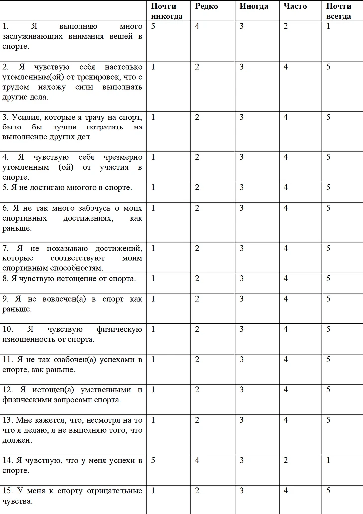 15 утверждений объединены в 3 шкалы, отражающие ответные реакции спортсменов на длительные эмоциональные и физические перегрузки. В каждой шкале содержится 5 утверждений, которые предлагается оценить с помощью следующих вариантов ответа: почти никогда, редко, иногда, часто, почти всегда. Нужно выбрать один из вариантов ответа по каждому суждению. Каждому ответу присваивается определенный балл. Методика позволяет выявить 3 показателя психического выгорания: уменьшение чувства достижения, эмоциональное/ физическое истощение, обесценивание достижений.