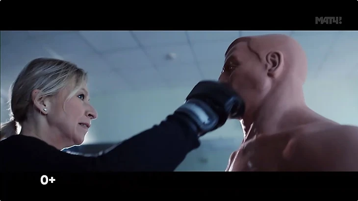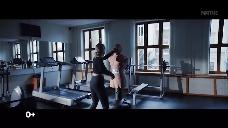 Сначала Захарова бьет манекен с наклейкой «пресса» в спортзале – вставки с этими кадрами мелькают, пока она идет с папочкой в костюме и на каблуках (кстати, вот объяснение от героини, почему «пресса» – это не «пресса», а «пресс»: «Обозначает место пресса на манекене. Там кубики – чтобы не промахнуться»).