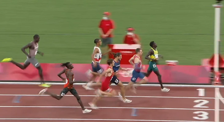 .Но последний забег был замечен не только перформансом Ротича. В нем принимал участие и главный фаворит соревнований Найджел Амос. Он шел 4-м на последнем вираже и в тот момент, как справа от него начал появляться стремительно летящий к финишу кениец, прямо перед ним неожиданно упал американец Исайя Джюветт (Isaiah Jewett). Ботсваниец не смог уклониться и тоже упал, потеряв шансы на борьбу за проходные места в забеге. Несмотря на такой сложный и разочаровывающий для обоих момент, они не стали разбираться, кто виноват, а проявили настоящую спортивную солидарность — пожали друг другу руку, обнялись и вместе медленно добежали до финиша.