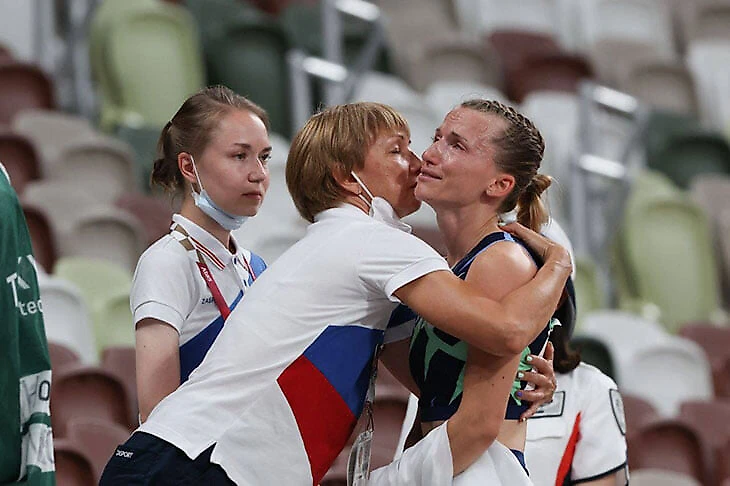 Эмоции улеглись не сразу – на трибунах Сидорову встречала тренер Светлана Абрамова, которая заботливо укутала ученицу во флаг Олимпийского комитета России.
