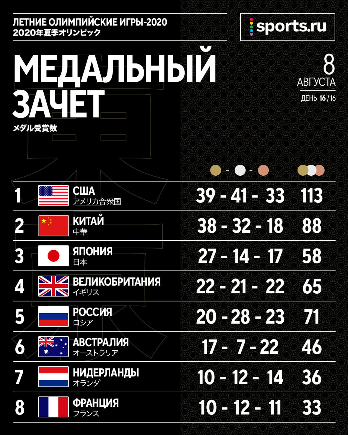 • зато, например, США резко просели – если пять лет назад они уезжали из Рио с 46 золотыми медалями, то из Токио везут только 39 (хотя и этого хватает для первого места). Но здесь все объяснимо относительными провалами в плавании и легкой атлетике – коронных американских видах;