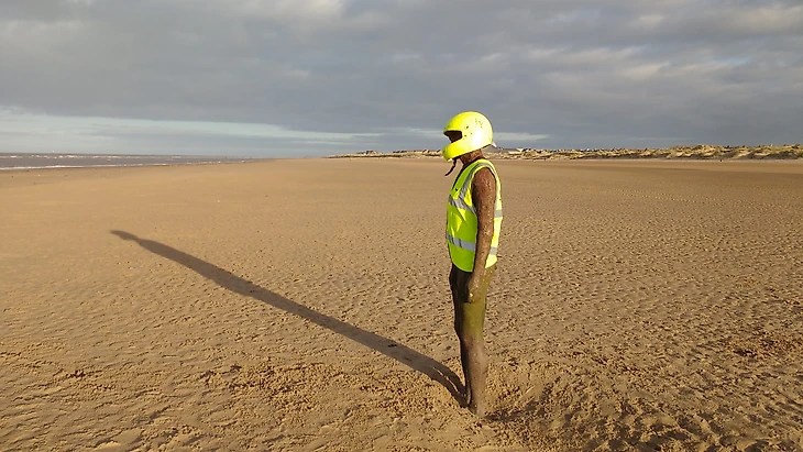 Одна из скульптур стоит в начале нашей трассы, а затем мы пробегаем мимо четырех других, которые стоят одетые в яркие волонтерские манишки, когда мы движемся вверх или вниз по пляжу. Последнего металлического человека, в месте разворота, зовут Бинг. Это потому, что мы бегаем по пляжу Кросби, а там некогда был известный американский певец по имени Бинг Кросби. Бинг — наш постоянный волонтер. У остальных фигур нет имён.