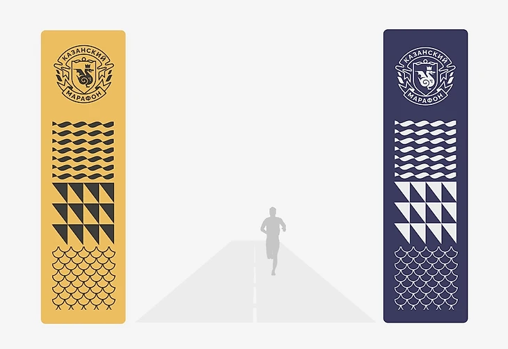 Паттерны в обновленном фирменном стиле напоминают течение воды — здесь мы сразу вспоминаем о реке Казанке, которая протекает с северо-востока на запад через середину города и делит Казань на две соизмеримые по территории части. Часть маршрута Казанского марафона всегда проходит вдоль этой реки по Кремлевской набережной — одной из самых длинных и красивых набережных в Европе.