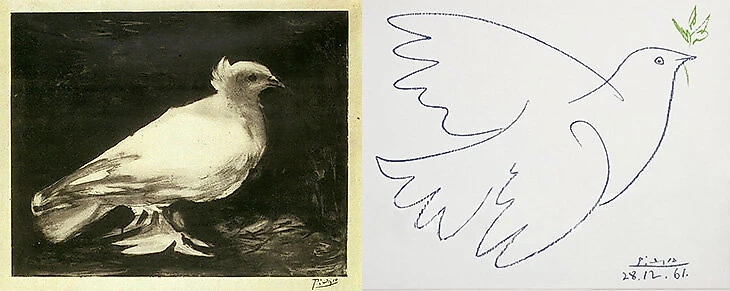 Позже Пикассо переосмыслил рисунок и нарисовал летящего голубя с оливковой веткой в графичной, линейной технике. Именно более поздний вариант обрел популярность и стал одной из знаковых работ в карьере Пикассо.