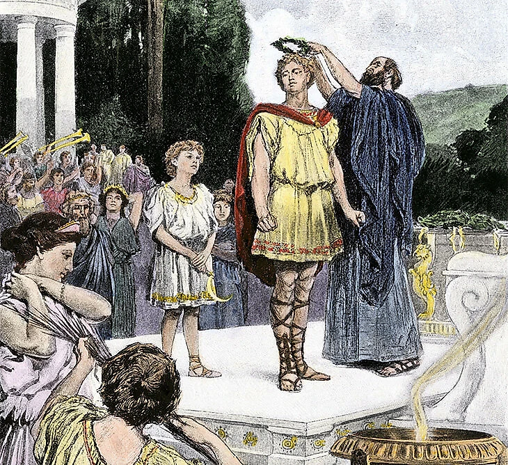 Есть еще лавровый венок – это тоже символ победы, его тоже вручали на состязаниях в Древней Греции, но путать их не надо. Таким награждали на Пифийских играх, которые проводили в Дельфах в честь Аполлона, а лавр – священное дерево этого бога.