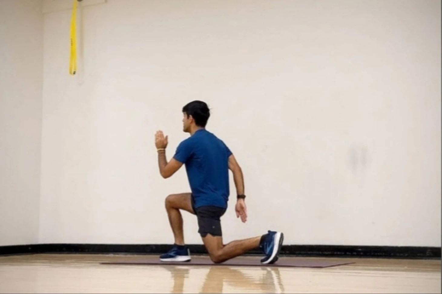 Как делать: Встаньте ровно, ноги вместе. Сделайте длинный шаг назад правой ногой и опуститесь в выпад (обратный выпад), согнув оба колена на 90 градусов. Оттолкнитесь левой ногой, чтобы встать, поднимая правое колено вверх, сохраняя при этом угол 90 градусов, пока бедро не окажется параллельно полу. Сделайте шаг назад в выпад. Повторите. Сделайте 10 повторений. Затем поменяйте сторону и повторите 10 раз.