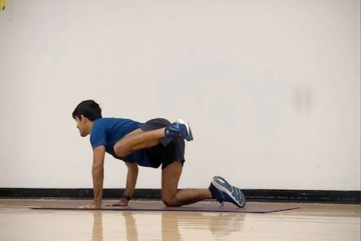 Как это сделать: Встаньте на четвереньки, руки прямо под плечами, а колени прямо под бедрами. Задействуйте корпус и поднимите левую ногу вверх и двигайте ей в направлении от тела, согнув колено под углом 90 градусов. Другая нога при этом находится внизу. Повторите. Сделайте 10 повторений. Затем поменяйте сторону и повторите 10 раз.