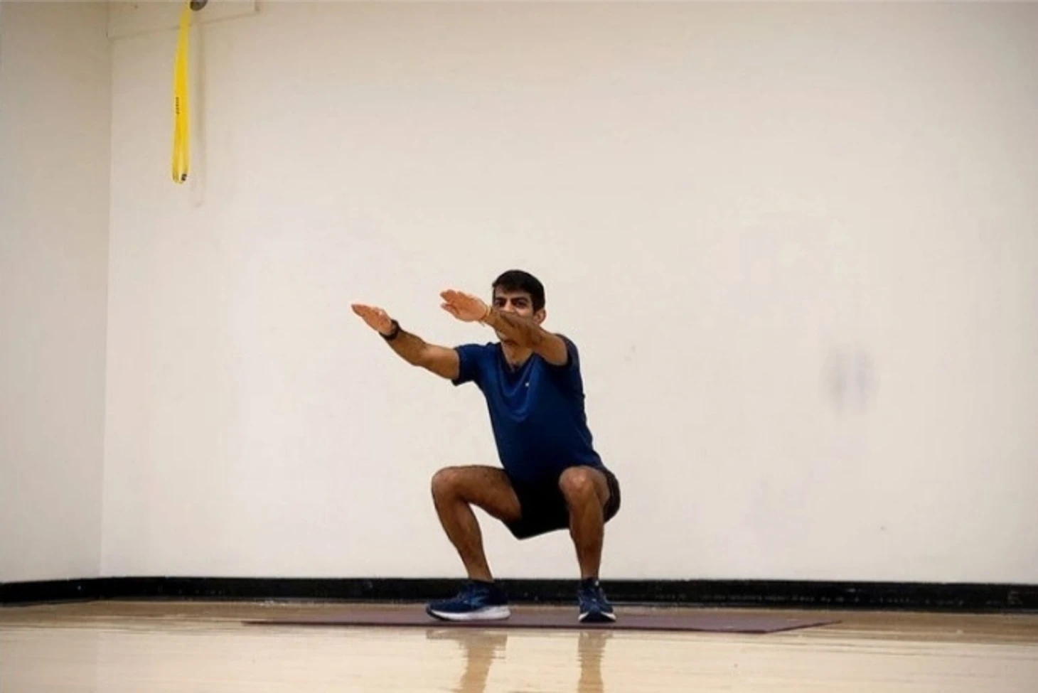 Как выполнять: Встаньте, расположите ноги на ширине плеч, при этом носки развернуты на 45 градусов. Таз находится в нейтральном положении, при этом положении направьте бедра назад и вниз, согните колени, пока бедра не будут расположены параллельно земле. Не забывайте держать колени и пальцы ног на одной линии, а грудь приподнимать во время активной фазы выполнения упражнения. С помощью мышц ног вернитесь в исходное положение. Сделайте 10 повторений.