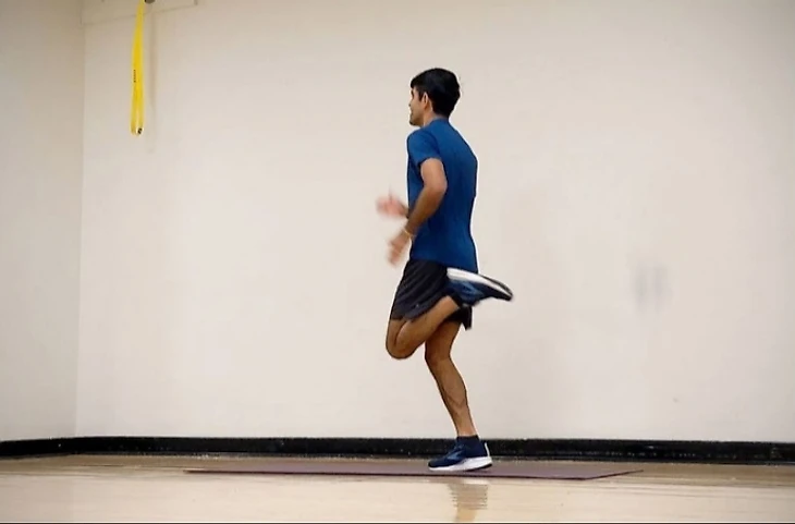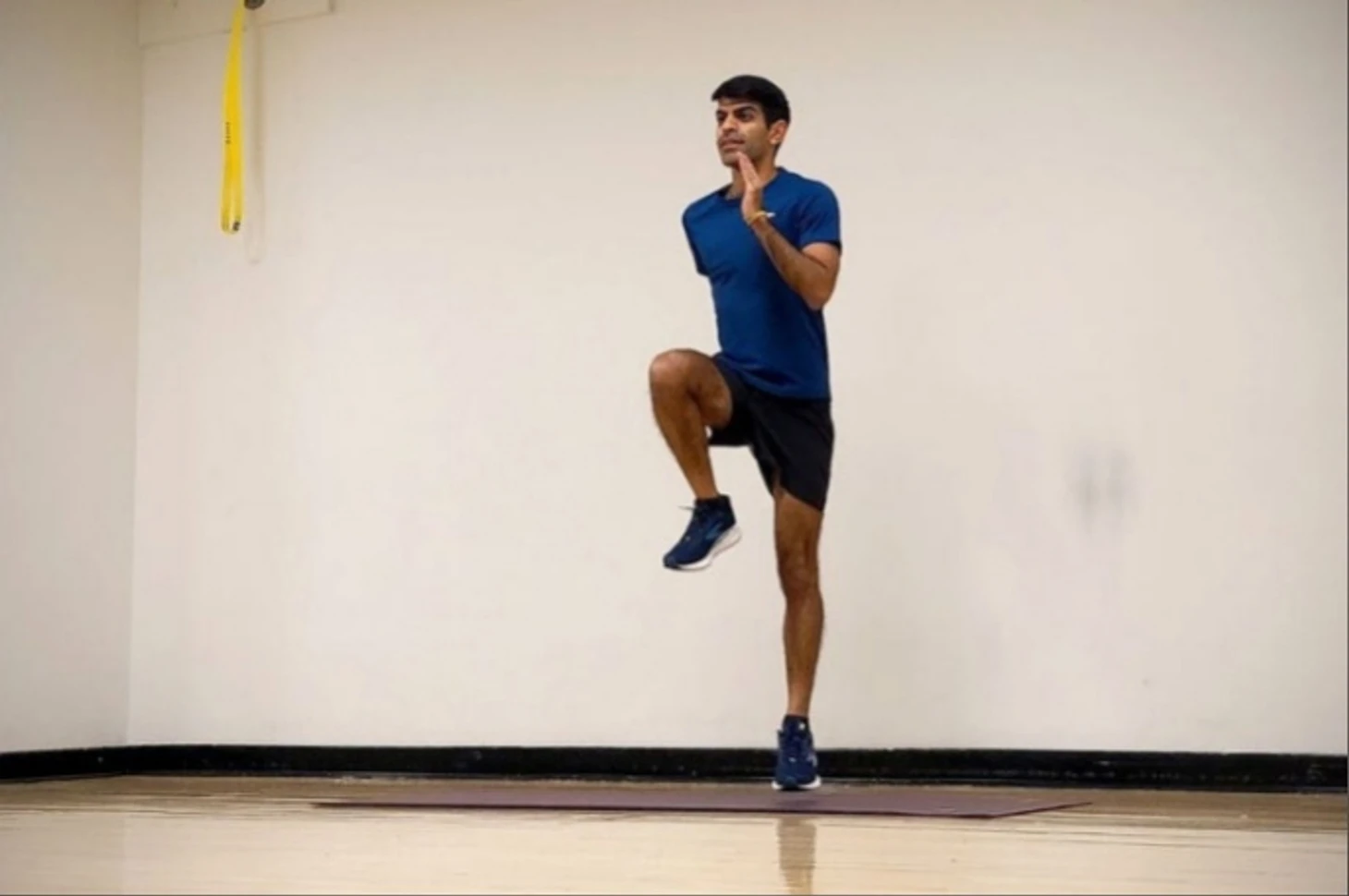 Как выполнять: Встаньте, расположите ноги на ширине плеч. Прыгающим движением поднимите левую ногу на высоту бедра, одновременно вставая на носок правой стопы, левую руку синхронно направьте вперед, правую назад. Держите плечи и бедра на одном уровне. Отведите левую ногу назад. Затем поднимите правую ногу на высоту бедра, одновременно вставая на носок левой стопы, правую руку синхронно направьте вперед, левую руку назад. Продолжайте чередовать. Сделайте по 10 повторений на каждую сторону.