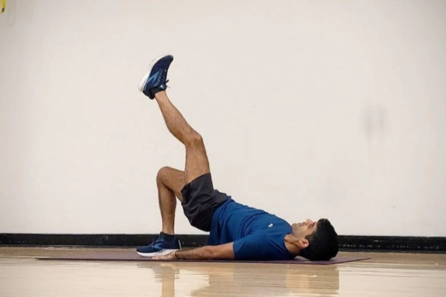 Как выполнять: Лягте лицом вверх, руки опущены по бокам, ладони обращены вниз, колени согнуты, с опорой на ступни. Поднимите левую ногу от земли и выпрямите ногу к потолку. Это исходная позиция. Задействуйте ягодицы и прижмите противоположную ногу к поверхности для того чтобы поднять бедра. Медленно опуститесь обратно в исходное положение. Повторите. Сделайте 10 раз. Затем поменяйте сторону и сделайте 10 повторений.