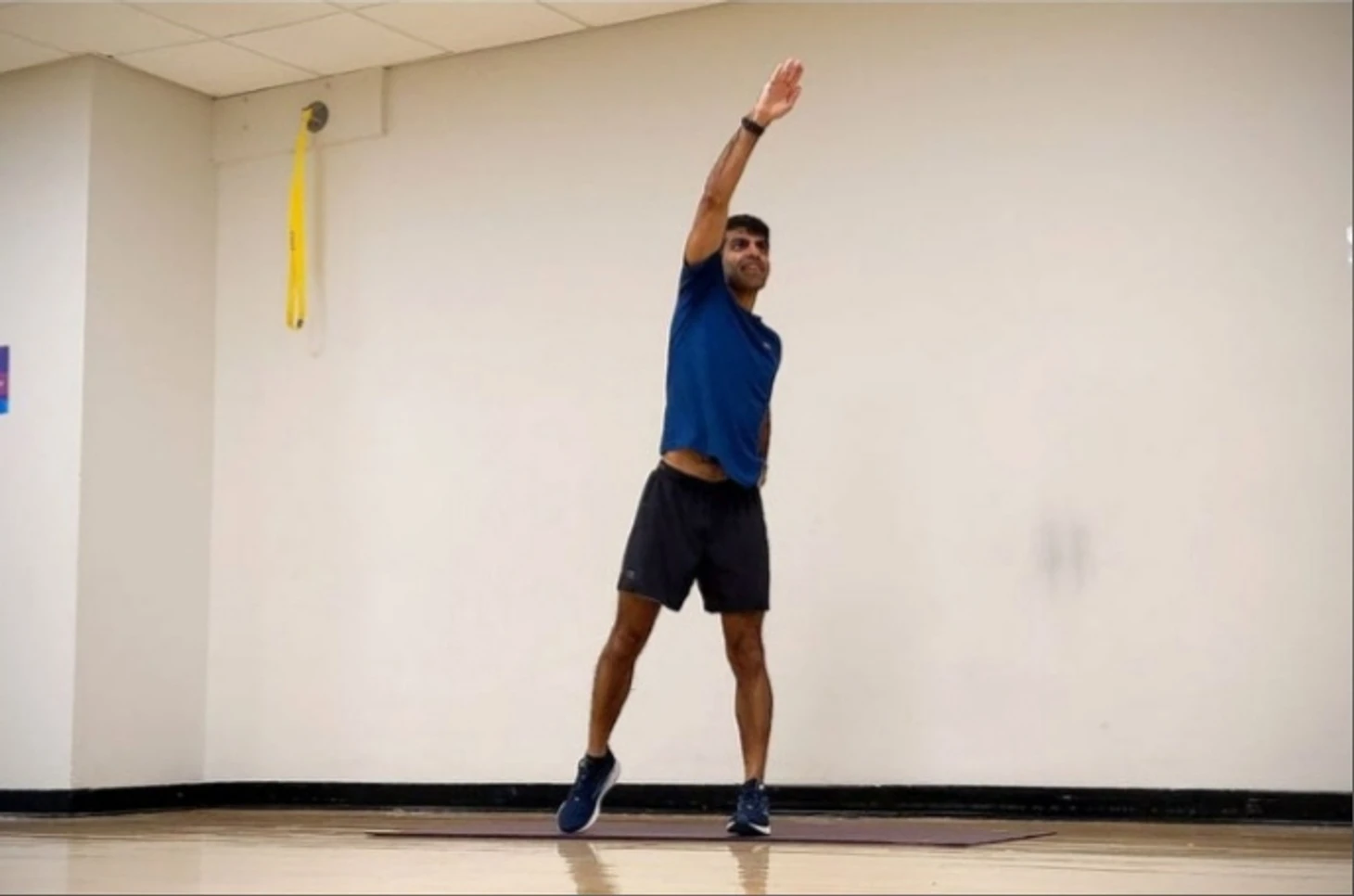 Как выполнять: Встаньте, ноги расположены на ширине плеч, руки на бедрах. Это исходная позиция. Повернитесь на правой ноге и вытяните правую руку вверх и над головой по направлению влево. Вернитесь в исходное положение. Повторите с поднятой вверх левой рукой. Продолжайте чередовать. Сделайте по 10 повторений в каждую сторону.